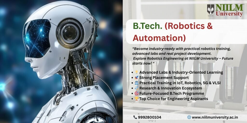 NIILM University has emerged as a leader in engineering education with strong industry alignment, state-of-the-art infrastructure and a learning environment focused on creativity and growth. The B Tech in Robotics and Automation programme at NIILM University is designed to make students industry-ready through hands-on skills, practical research and direct exposure to modern automation technologies.